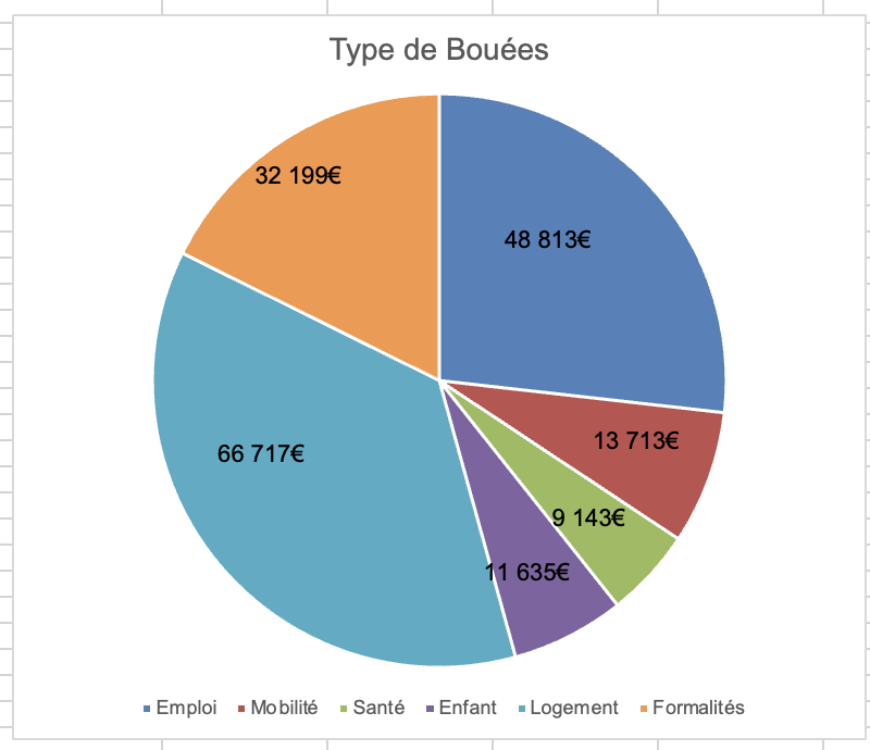 Sur l’exercice 2023-2024 nous avons distribué 560 Bouées pour un montant de 189 219 € pour soutenir des personnes dans le besoin. 27% de ces dépenses sont allées dans le secteur de l’emploi et la formation, 37% dans le pôle habitat et 18% dans l’intégration. Ils constituent les 3 pôles dans lesquels nous avons été les plus actifs. Les frais de gestion n’ont constitué que 3,3% des dépenses durant l’exercice 2023-2024.