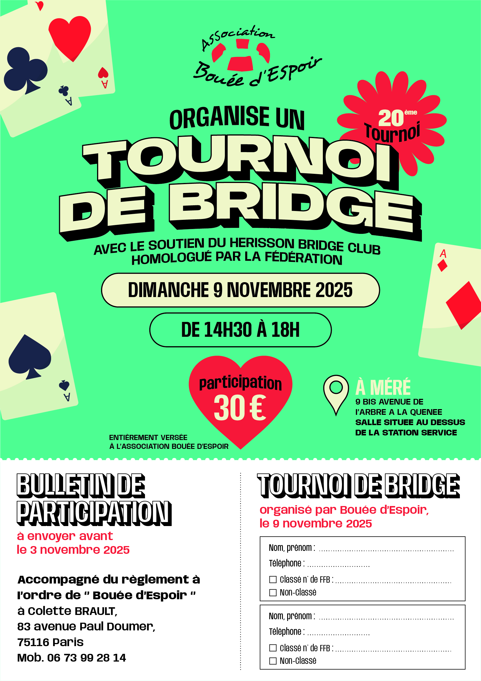 Nous attendons de nombreux bridgeurs adhérents et sympathisants de Bouée d’Espoir.